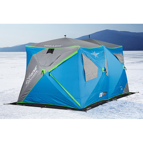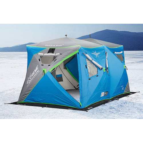 Зимняя палатка Higashi Double Pyramid Extreme представляет собой улучшенную версию палаток Hot. Эта палатка создана для самых суровых зимних условий. Используется двойной утеплитель и ламинация, ткань Nylon 300D. Внутри палатки сохраняется оптимальный микроклимат - нет конденсата или обледенения. Большие прозрачные окна с плотными шторками пропускают свет, но удерживают тепло. Усиленные пластиковые вставки не трескаются на морозе, а светоотражающие элементы делают палатку заметной в темноте. Предусмотрена новая возможность подключить внешний жидкотопливный обогреватель на дизеле или бензине.